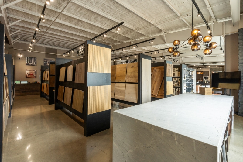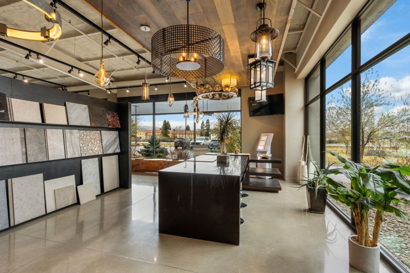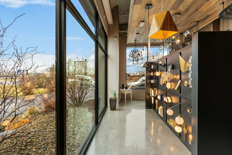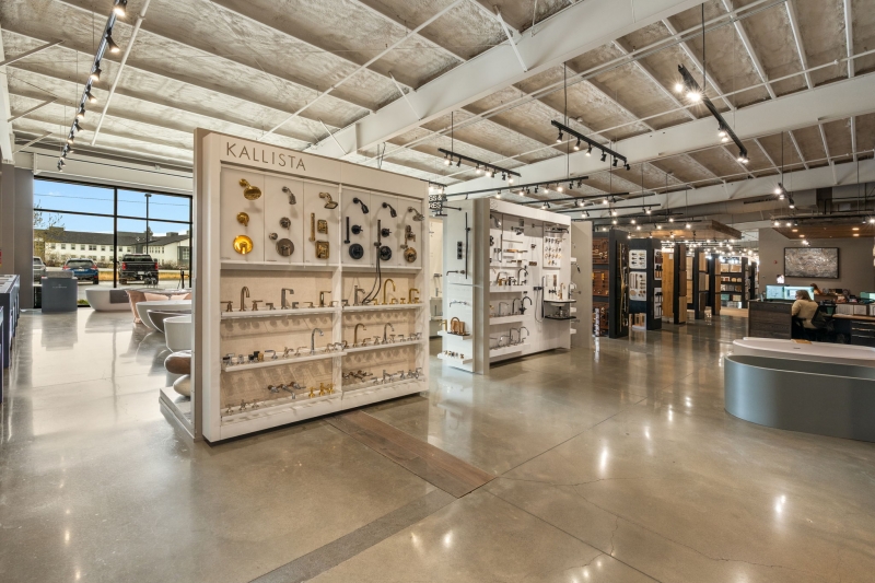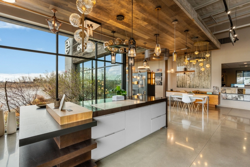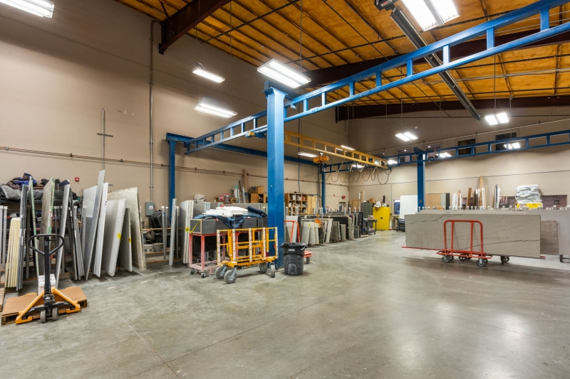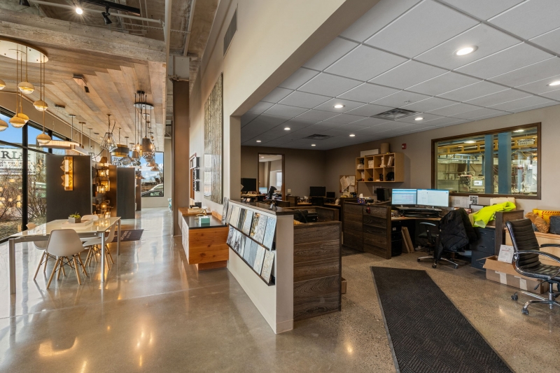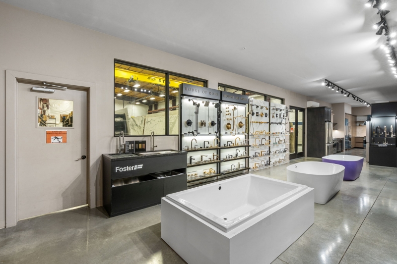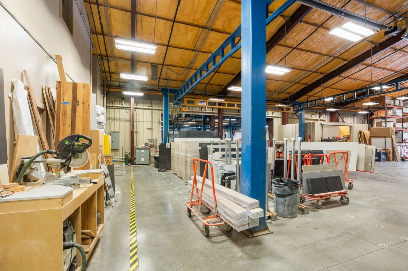 The property features a custom architectural façade, extensive glass storefront exposure, and seven fully built‑out showroom departments serving architects, designers, and high‑net‑worth clientele. The rear fabrication area includes advanced CNC machinery, water‑jet cutting, overhead crane systems, and loading dock access—creating a vertically integrated operational environment.