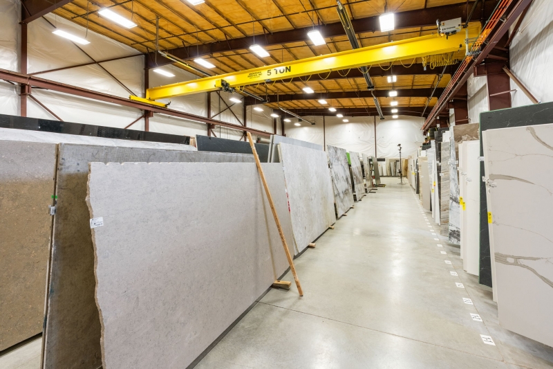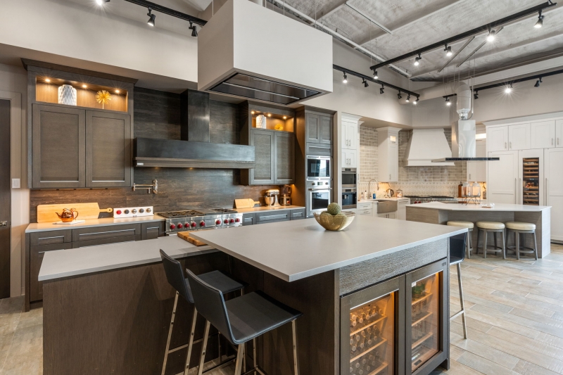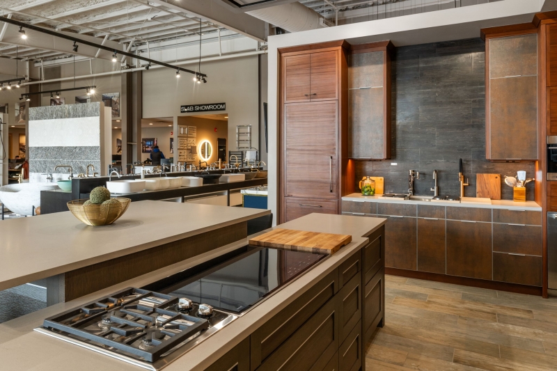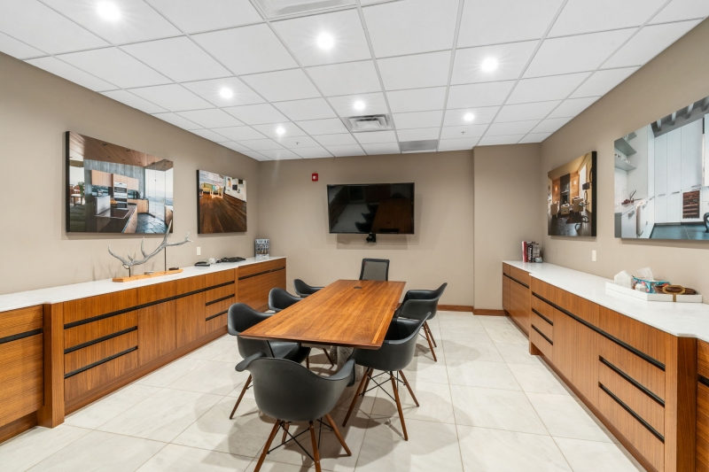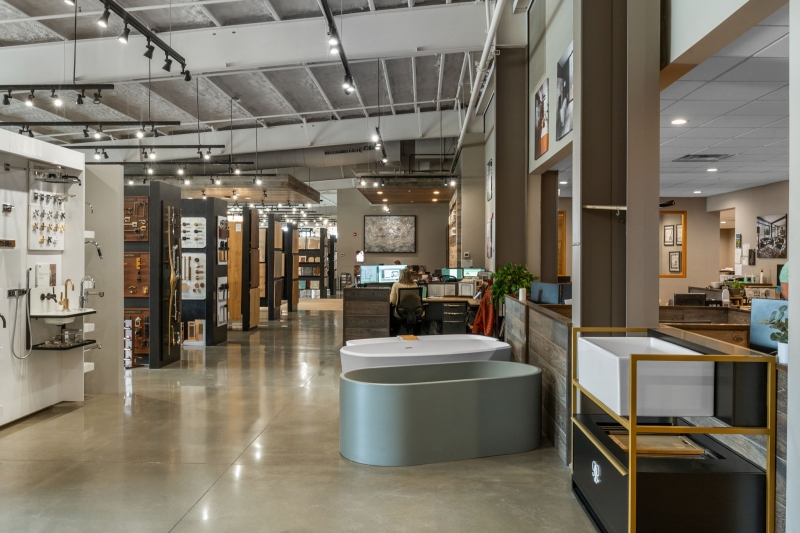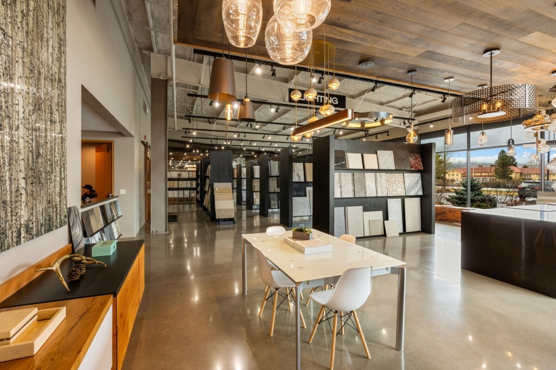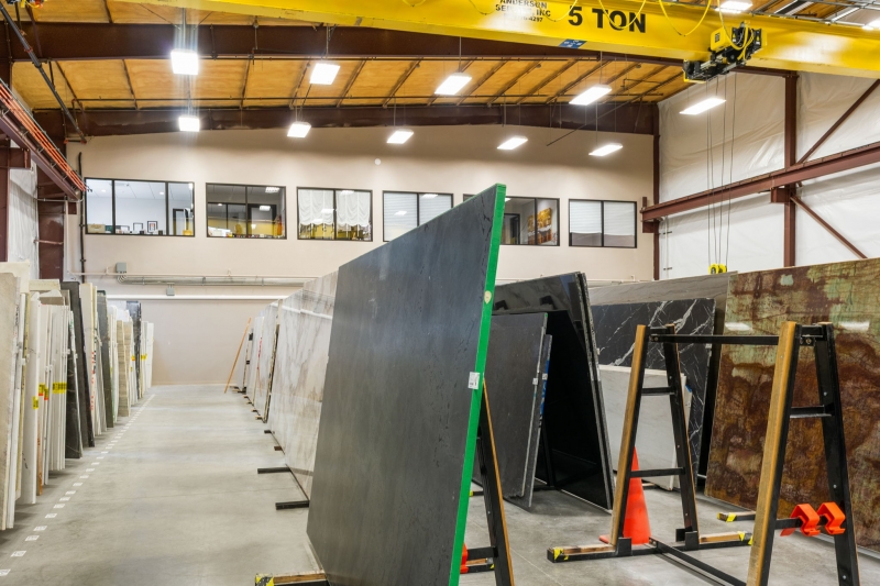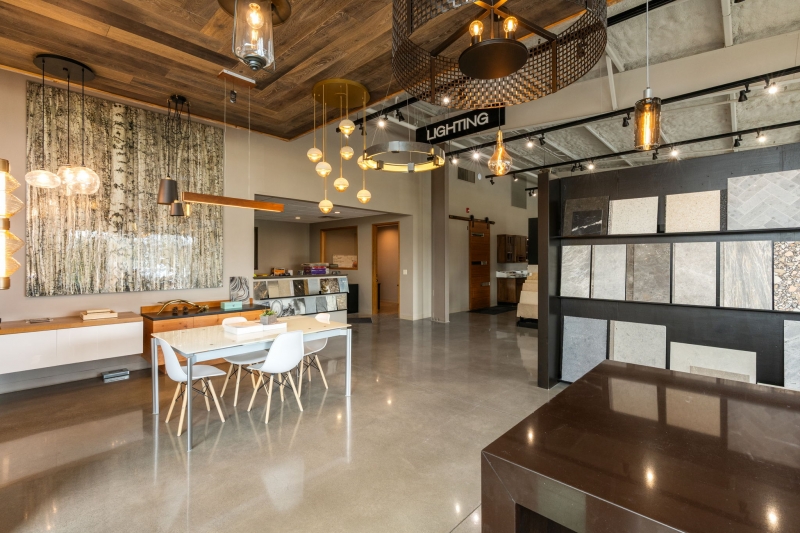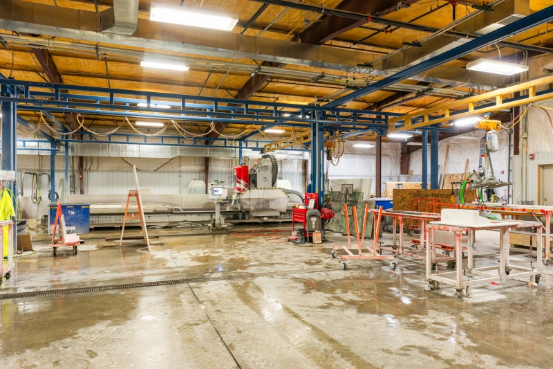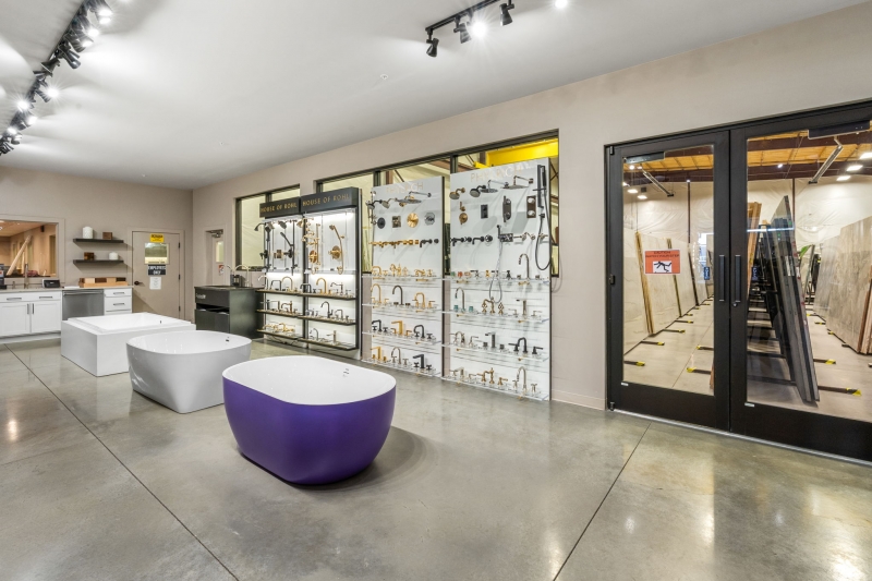 The property features a custom architectural façade, extensive glass storefront exposure, and seven fully built‑out showroom departments serving architects, designers, and high‑net‑worth clientele. The rear fabrication area includes advanced CNC machinery, water‑jet cutting, overhead crane systems, and loading dock access—creating a vertically integrated operational environment.